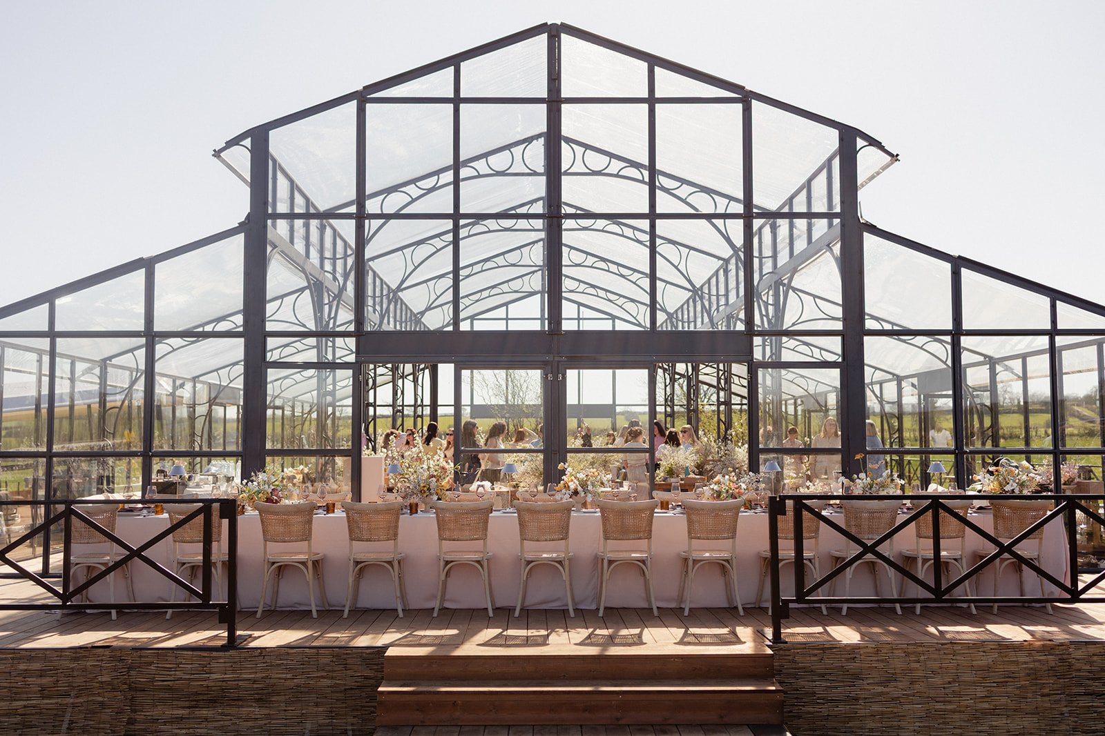 The Orangery is an elegant and highly versatile structure designed to accommodate up to 120 guests (2026) and 150 guests (2027 onwards). It provides exceptional flexibility, allowing you to seamlessly stage every element of your celebration. Guests can enjoy a refined reception within the bright space, transition to open-air dining on the connected terrace, or utilise the exterior as a breathtaking setting for sunset ceremonies. The venue is specifically designed to transition effortlessly into the evening, offering a sophisticated candlelit atmosphere that maintains a cohesive flow between the luxurious interior and the surrounding vineyard landscape.